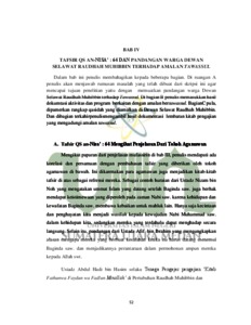 Pembahasan skripsi ini mengenai amalan bertawassul merujuk pada QS anNisa’ : 64. Tawassul merupakan salah satu bentuk doa kepada Allah swt.. Kebelakangan ini, persoalan tawassul dengan ruh orang saleh timbul kembali dalam masyarakat Islam karena iyanya menjadi kasus perbalahan dan kontroversi oleh sebagian pihak yang kurang senang dan bertujuan untuk mengelirukan kefahaman ummat Islam terhadap keyakinan mereka. Perbincangan terkait tawassul ini sama ada sebagai salah satu elemen yang berkaitan dengan akidah, atau iyanya bida’ah yang menjerumus kepada kesesatan atau iyanya sunnah Rasulullah saw.. Penulis menyiapkan penelitian skripsi ini bersama warga Dewan Selawat Pertubuhan Raudhah Muhibbin. Dengan adanya penelitian ini, penulis mengharapkan setiap individu dari warga Dewan Selawat dan masyarakat muslim mampu menjadi penyambung umtuk melestarikan tradisi amalan tawassul dengan tidak dikecualikan jenis tawassul dengan ruh orang saleh agar dapat memperingati para kekasih Allah swt. sebagai wasilah dalam tiap-tiap doa yang dipanjatkan kepada Allah swt.. Agar konsep tawassul yang sebenar dapat dijernihkan dan diperkokohkan sebagaimana yang dituntut oleh Alquran dan as-Sunnah, dengan kata lain, iya diharapkan dapat menjadi panduan mudah dalam perlaksanaan amalan tawassul