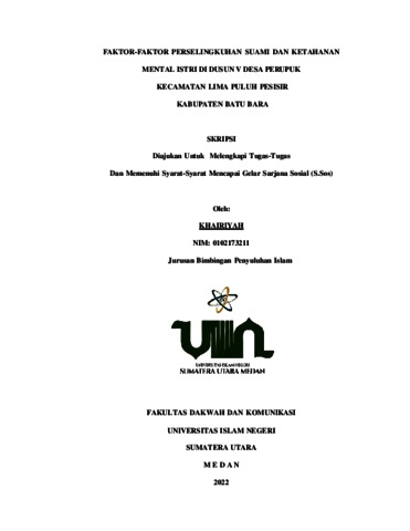 KHAIRIYAH, KHAIRIYAH (2023) FAKTOR-FAKTOR PERSELINGKUHAN SUAMI DAN KETAHANAN MENTAL ISTRI DI DUSUN V DESA PERUPUK KECAMATAN LIMA PULUH PESISIR KABUPATEN BATU BARA. Skripsi thesis, State Islamic University of North Sumatra.