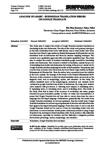 This study aims to analyze the results of Google Translate machine translation in translating Arabic into Indonesian. The data of this study used primary data types in the form of literature from books with library sources were Arabic texts taken from the book Nurul Yaqin written by Sheikh Muhammad Al Khudari Bek and his translation books in Indonesian and taken by random sampling technique. This research uses a qualitative approach with a descriptive qualitative type. This study aims to analyze the results of machine translation google translate in translating Arabic into Indonesian. This research is related to translation, namely the process of translating from Arabic into Indonesian by looking at the process carried out by Google Translate and then analyzing the results of the translation. The primary data is in the form of Arabic texts taken from the book Nurul Yaqin written by Sheikh Muhammad Al Khudari Bek. Then the author takes researched from the subtitles in the book, namely, the cleavage of the breast of the Prophet Muhammad SAW. The focus of this research is to find out what translation errors are focused on the linguistic level, such as morphology, syntax, and semantics. In this study, the authors identified errors at the morphological, syntactical, and semantic levels contained in google translate from Arabic to Indonesian. By using error analysis (error analysis) with procedures, 1) collecting error samples, 2) identifying errors, 3) explaining errors, 4) classifying errors, and 5) evaluating errors. The results of the study show that in terms of the accuracy of vocabulary and terms, google translate has good translation quality. In terms of clarity and reasonableness, it means that Google Translate has not been able to convey ideas from the source language into the target language. Furthermore, grammatically, the results from Google Translate translation do not have grammar, then the results from Google Translate translation do not have a good grammatical structure and follow the rules that apply in the target Indonesian language. From these data, it can be seen that Google Translate should not be used as a basis for translating Arabic texts into Indonesian. A novice translator should prefer a dictionary instead of using Google Translate to try and improve their translation skills. So far, Arabic is still a difficulty for Indonesians, especially for students, and this difficulty is a linguistic problem that includes phonology, syntax, morphology, and semantics.
