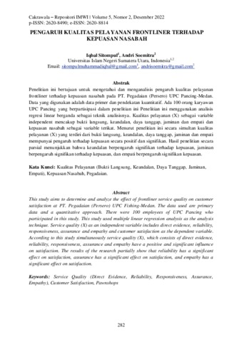 Sitompul, Iqbal and Soemitra, Andri (2022) ENGARUH KUALITAS PELAYANAN FRONTLINER TERHADAP KEPUASAN NASABAH. empati, 5 (2). pp. 282-289. ISSN 2620-8490, 2620-8814