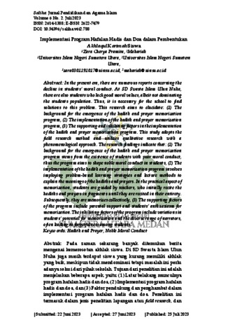 Pramita, Zara Cherya and Mahariah, Mahariah (2023) Implementasi Program Hafalan Hadis dan Doa dalam Pembentukan Akhlaqul Karimah Siswa. Saliha: Jurnal Pendidikan dan Agama Islam, 6 (2). pp. 1-16. ISSN 2614-1388