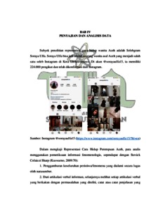 Penelitian ini berjudul “Representasi Gaya Hidup Perempuan Aceh (Studi Fenomena Selebgram @sorayaulfa)”. Tujuan penelitian ini adalah untuk mengetahui fenomena selebgram @sorayaulfa15 di kalangan perempuan Aceh di Lhokseumawe dalam merepsentasikan gaya hidupnya mengenai konten food (makanan & minuman), fun (kesenangan), dan fashion (pakaian) di Instagram. Teori yang di gunakan untuk mengetahui hasil penelitian adalah Teori Representasi. Objek penelitian adalah akun instagram selebgram @sorayaulfa15 dengan pengikut 224.000 ribu dan 5 orang masyarakat Kota Lhokseumawe yang mengikuti akun tersebut. Metode yang di gunakan adalah deskriptif kualitatif dengan pendekatan fenomenologi. Hasil penelitian menunjukkan bahwa perempuan dalam media selalu di tampilkan sesuai standart kecantikan yang sudah dibentuk oleh media sendiri. Informan dalam penelitian ini memiliki ideologi kecantikan yaitu kecantikan tetap dilihat dari fisik serta penampilan yang menarik dengan busana menutup aurat namun tetap trendi sesuai gaya hidup perempuan hijab kekinian.