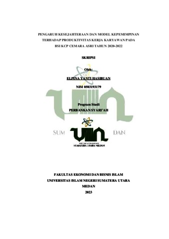 Elpina Yanti Hasibuan (0503193179), “Pengaruh Kesejahteraan Dan Model Kepemimpinan Terhadap Produktivitas Kerja Karyawan Pada BSI KCP Cemara Asri Tahun 2020 - 2022” dibawah bimbingan Ibu Dr.Hj Yenni Samri Nasution, MA sebagai Pembimbing Skripsi I dan Ibu Nurul Inayah, M.E sebagai Pembimbing Skripsi II Penelitian ini bertujuan untuk menguji pengaruh kesejahteraan dan model kepemimpinan terhadap produktivitas kerja karyawan pada BSI KCP Cemara Asri baik itu secara parsial maupun secara simultan.Penelitian ini menggunakan metode kuantitatif dengan pengumpulan data menggunakan metode skala likert. Subjek yang digunakan dalam penelitian ini adalah karyawan BSI KCP Cemara Asri Tahun 2020 – 2022 yang berjumlah 33 responden dan diambil dengan menggunakan teknik sampling. Teknik analisa data melaui program IBM SPSSstatistic 26. Hasil dari penelitian ini menunjukkan bahwa: Pertama, Kesejahteraan berpengaruh positif dan signifikan terhadap Produktivitas Kerja Karyawan dengan nilai signifikansi 0,042 < 0,05. Kedua, Model Kepemimpinan berpengaruh positif dan signifikan terhadap Produktivitas Kerja Karyawan dengan nilai signifikansi 0,031 < 0,05.Ketiga, Kesejahteraan dan model kepemimpinan berpengaruh positif dan signifikan terhadap Produktivitas Kerja Karyawan dengan nilai signikan 0,028 < 0,05.