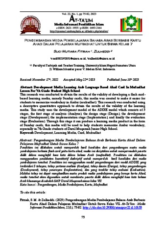 Fitriah, Suci Mutiara and Zulheddi, Zulheddi (2023) Pengembangan Media Pembelajaran Bahasa Arab Berbasis Kartu Ahad Dalam Pelajaran Mufradhat Untuk Siswa Kelas 7. Pengembangan Media Pembelajaran Bahasa Arab Berbasis Kartu Ahad Dalam Pelajaran Mufradhat Untuk Siswa Kelas 7, 22 (1). pp. 75-82. ISSN 2621-1955 (Tidak diterbitkan (Unpublished) )