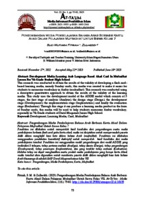 Penelitian ini dilakukan untuk memperoleh hasil kevalidan dari pengembangan suatu media pembelajaran berbasis flash card yaitu kartu ahad, media ini diciptakan untuk mempermudah peserta didik dalam menghafal kosa kata dalam bahasa Arab (mufradhat). Penelitian ini dilakukan menggunakan pendekatan kuantitatif deskriptif untuk memperoleh hasil kevalidan dari media pembelajaran tersebut. Penelitian ini menggunakan model pengembangan dari model ADDIE yang terdiridari 5 tahapan, tahap pertama analisis (Analyze), tahap desain (Design), tahap pengembangan (Development), tahap penerapan (Implemtation), dan yang terakhir tahap evaluasi (Evaluation). Melalui tahap ini dapat menghasilkan suatu produk media pembelajaran yang berupa kartu Ahad, media tersebut akan digunakan untuk membantu peserta didik dalam menghafal kosa kata bahasa Arab khususnya di sekolah SMP Darul Muqamah siswa kelas VII Kata kunci : Pengembangan, Media Pembelajaran, Kartu, Mufradhat.