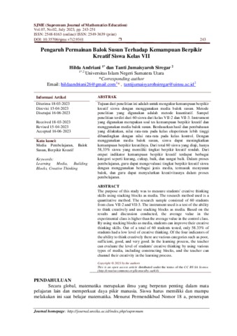 Andriani, Hilda and Siregar, Tanti Jumaisyaroh (2023) Pengaruh Permainan Balok Susun Terhadap Kemampuan Berpikir Kreatif Siswa Kelas VII. Pengaruh Permainan Balok Susun Terhadap Kemampuan Berpikir Kreatif Siswa Kelas VII, 7 (2). pp. 243-251. ISSN 548-8163 (Tidak diterbitkan (Unpublished) )