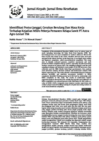 Keluhan Musculoskeletal Disorders (MSDs) terjadi pada berbagai jenis pekerjaan termasuk pekerjaan pemanen Tandan Buah Segar (TBS) Kelapa Sawit. Proses pemanenan dapat menyebabkan keluhan pada pekerja yang seringnya berupa nyeri dan keram pada pergelangan tangan, nyeri bahu dan punggung nyeri leher serta nyeri pada siku dan kaki, Jika otot pada bagian tubuh yang merasakan nyeri tersebut dilakukan dengan posisi kerja yang janggal, gerakan berulang pada durasi jangka panjang maka dapat memicu keluhan sendi, tendon mauopoun ligament, keluhan tersebutlah yang dinamakan keluhan muskulosekletal. Penelitian ini bertujuan untuk mengidentifikasi postur janggal, Gerakan berulang dan masa kerja terhadap keluhan MSDs yang dirasakan oleh pekerja terkhusus pada pekerja panen kelapa sawit yang dilakukan pada bulan Januari 2023. Teknik pengambilan sampel menggunakan Teknik total sampling dan diperoleh jumlah sampel keseluruhan pemanen TBS sebanyak 224 responden. Pengumpulan data menggunakan kuisioner NBM (Nordic Body Map). Analisis data menggunakan analisis univariat, analisis bivariat dan analisis multivariat dengan uji regresi logistik. Hasil penelitian menunjukkan hubungan postur janggal (p=0,000), gerakan berulang (p=0,001) terhadap keluhan MSDs.Teridentifikasi Masa kerja (p=0,106) tidak memiliki hubungan dengan keluhan MSDs pada penelitian ini. Hasil analisis multivariat regresi logistik menunjukkan variabel yang paling berpengaruh terhadap keluhan MSDs adalah postur janggal dengan (Odd Ratio=10, 024) dengan nilai p value sebesar 0,048 (<0,05). Untuk menghindari keluhan muskulosekletas perusahaan harus meningkatkan pengawasan rutin dan melakukan pelatihan manual handling yang baik kepada pekerja panen kelapa sawit