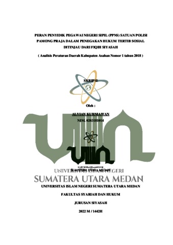 Nama: Alvian Kurniawan. NIM: 0203181014. Judul: “PERAN PENYIDIK PEGAWAI NEGERI SIPIL (PPNS) SATUAN POLISI PAMONG PRAJA DALAM PENEGAKAN HUKUM TERTIB SOSIAL DITINJAU DARI FIQIH SIYASAH ( Analisis Peraturan Daerah Kabupaten Asahan Nomor 1 tahun 2018 )”. Fenomena pelacuran, tindak asusila, dan perselingkuhan merupakan tindakan kriminalitas yang sangat sulit untuk ditangani banyak ditemukan di pemerintahan kabupaten Asahan, walaupun Adanya Peraturan Daerah guna pencegahan dan pemberantasan tindak penyakit masyarakat, pencegahann dan pemberantasan tindak asusila perlu adanya peranan dalam penegakan Peraturan Daerah. Tujuan penelitian ini adalah untuk mengetahui Peran Penyidik Pegawai sipil (PPNS) Satuan Polisi Pamong Praja Kabupaten Asahan. Hambatan yang timbul dalam melakukan penegakkan Tertib Sosial, Untuk Mengetahui Pandangan Fiqh Siyasah dalam melakukan Penegakan Hukum Tertib Sosial (pelacuran, tindak asusila dan perselingkuhan). Metode yang digunakan adalah metode penelitian yuridis empiris, menggunakan jenis penelitian lapangan, yaitu menggunakan teori yang sudah ada kemudian dikembangkan dengan kondisi lapangan, dengan menggunakan deskriptif analisis yang mengungkapkan peraturan perundang-undangan dan aturan-aturan lain yang berkaitan dengan teori-teori objek penelitian. Hasil penelitian menunjukkan bahwa Satuan Polisi Pamong Praja Kabupaten Asahan masih belum mengoptimalkan peranan Penyidik Pegawai Negeri Sipil dalam melakukan penyidikan penegakkan tertib sosial saat razia penyakit masyarakat (Pekat). Penyidik juga memiliki hambatan dalam melakukan penyidikan karena sedikit jumlah penyididik di Satuan Polisi Pamong Praja, kekurangan dana dalam penanganan pelanggaran perda, masih adanya oknum pejabat yang melindungi tempat tempat yang pelanggaran tindak asusila untuk kepentingan pribadi. Saran dalam penelitian ini Kepada penyidik pegawai negeri sipil Satpol PP diharapkan untuk merekomendasi melalui Kepala Satpol PP kepada Pemerintahan Derah kabupaten Asahan dalam Menyusun PerBud terkait dengan penjelasan teknis dalam penyidikan pelanggaran ruang lingkup tertib sosial.