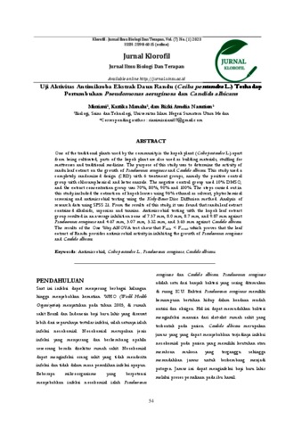 Misriani, Misriani and Manalu, Kartika and Nasution, Rizki Amelia (2023) Uji Aktivitas Antimikroba Ekstrak Daun Randu (Ceiba pentandra L.) Terhadap Pertumbuhan Pseudomonas aeruginosa dan Candida albican. Jurnal Klorofil Jurnal Ilmu Biologi Dan Terapa, 7 (1). pp. 54-60. ISSN 2598-6015