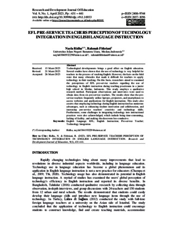Rdha, Nayla and Fithriani, Rahmah (2023) EFL PRE-SERVICE TEACHERS PERCEPTION OF TECHNOLOGY INTEGRATION IN ENGLISH LANGUAGE INSTRUCTION. Research and Development Journal Of Education, 9 (1). pp. 431-441. ISSN 2657-1056