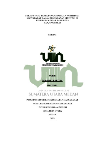 KARTIKA, NIA RIZKI (2022) FAKTOR YANG BERHUBUNGAN DENGAN PARTISIPASI MASYARAKAT DALAM PENANGANAN STUNTING DI KELURAHAN PASAR BARU KOTA TANJUNG BALAI. Skripsi thesis, UNIVERSITAS ISLAM NEGERI SUMATERA UTARA.