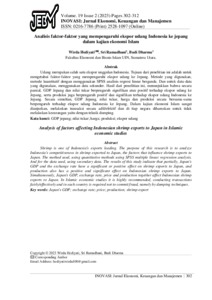Udang merupakan salah satu ekspor unggulan Indonesia. Tujuan dari penelitian ini adalah untuk mengetahui faktor-faktor yang mempengaruhi ekspor udang ke Jepang. Metode yang digunakan, metode kuantitatif dengan menggunakan SPSS analisis regresi linear berganda. Dan untuk data-data yang digunakan, menggunakan data sekunder. Hasil dari penelitian ini, menunjukkan bahwa secara parsial, GDP Jepang dan nilai tukar berpengaruh signifikan atau positif terhadap ekspor udang ke Jepang, serta produksi juga berpengaruh positif dan signifikan terhadap ekspor udang Indonesia ke Jepang. Secara simultan, GDP Jepang, nilai tukar, harga dan produksi secara bersama-sama berpengaruh terhadap ekspor udang Indonesia ke Jepang. Dalam kajian ekonomi Islam sangat dianjurkan, melakukan transaksi secara adil/efektif dan di tiap negara diharuskan untuk tidak melakukan kecurangan yaitu dengan teknik dumping.