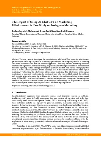Saputra, Raihan and Nasution, Muhammad Irwan Padli and Dharma, Budi The Impact of Using AI Chat GPT on Marketing Effectiveness: A Case Study on Instagram Marketing. The Impact of Using AI Chat GPT on Marketing Effectiveness: A Case Study on Instagram Marketing.