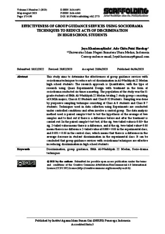 Kharismaylinda, Joya (2023) Effectiveness Of Group Guidance Services Using Sociodrama Techniques To Reduce Acts Of Discrimination In High School Students. Jurnal Pendidikan Islam dan Multikulturalisme, 5 (2). pp. 173-190. ISSN 2656-4491