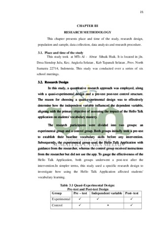 The research that has been conducted entitled “The effect of Hello Talk application on students’ vocabulary mastery at seventh grade Al-Abrar Sihuik-huik Tapanuli Selatan”. The primary objective of this study is to assess whether the Hello Talk application has a significant impact on the vocabulary skills of seventh-grade students at MTs Al-Abrar Sihuik-huik during the 20232024 academic year. This research employs a quantitative quasi-experimental approach and was carried out with a total of 40 students, divided into two groups: 20 in the experimental group and 20 in the control group. Data collection involved the administration of multiple-choice tests as evaluation tools, including a pre-test conducted before the intervention and a post-test conducted afterward. The collected data were statistically analyzed using a t-test in SPSS 23, with a significance level set at 5% (0.05). Analysis revealed that the experimental group's mean post-test score (83.5) was higher than the control group's (72) after all. The t-test result (3.162) exceeded the threshold t-value of 2.024 with 38 degrees of freedom at a 5% significance level (0.05). As a result, the result of the t0 > t table resulted in the alternative hypothesis (Ha) being accepted and the null hypothesis (H0) being rejected. Additionally, the calculated effect size was 1.30, which is within the range for strong effects. As a result, it can be said that the Hello Talk app significantly affects the language competency of seventh-grade pupils at MTs AlAbrar Sihuik-huik.