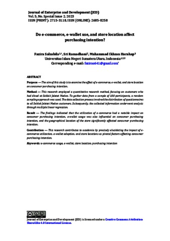 SALSABILA, FAZIRA and RAMADHANI, SRI and HARAHAP, MUHAMMAD IKHSAN (2023) Do e-commerce, e-wallet use, and store location affect purchasing intention? Journal of Enterprise and Development (JED). pp. 507-521. ISSN 2685-8258 (Submitted)