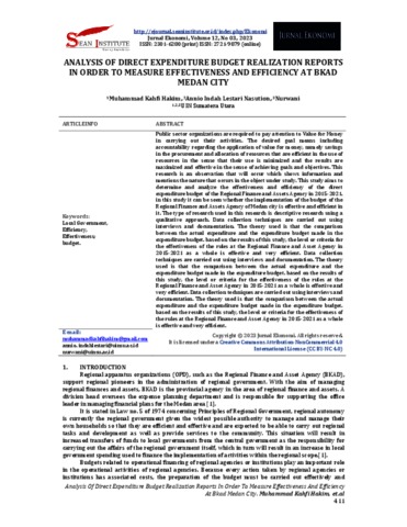 hakim, muhammad kahfi and nasution, annio and nurwani, nurwani (2023) ANALYSIS OF DIRECT EXPENDITURE BUDGET REALIZATION REPORTS IN ORDER TO MEASURE EFFECTIVENESS AND EFFICIENCY AT BKAD MEDAN CITY. ANALYSIS OF DIRECT EXPENDITURE BUDGET REALIZATION REPORTS IN ORDER TO MEASURE EFFECTIVENESS AND EFFICIENCY AT BKAD MEDAN CITY, 12 (03). pp. 411-418. ISSN 2301-6280