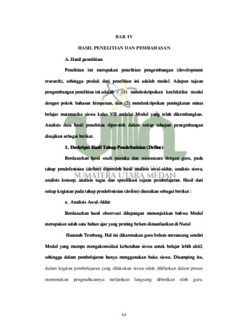 Penelitian ini bertujuan untuk mengembangkan produk berupa Modul Pembelajaran Matematika untuk meningkatkan minat belajar matematika siswa pada materi himpunan di kelas di kelas VII SMP Nurul Hasanah Tembung. Prosedur pengembangan modul pembelajaran matematika dalam penelitian ini mengacu pada model 4D yang dimodifikasi menjadi 3D, yakni : tahap pendefenisian (define), tahap perancangan (design) dan tahap pengembangan (develop). Instrumen yang digunakan dalam penelitian ini ialah lembar validasi untuk mengukur kevalidan modul pembelajaran yang dikembangkan dan tes untuk mengukur ke efektifan modul. Modul pembelajaran yang dikembangkan dalam penelitian ini dinyatakan valid, berdasarkan skor rata-rata validasi modul yaitu 91,35% yang memenuhi kategori sangat baik, penilain guru terhadap modul 90% dengan kategori sangat baik dan respon siswa dengan kategori sangat baik. Modul pembelajaran ini telah memenuhi kriteria efektif berdasarkan persentase ketuntasan belajar secara klasikal sebesar 88,88%.