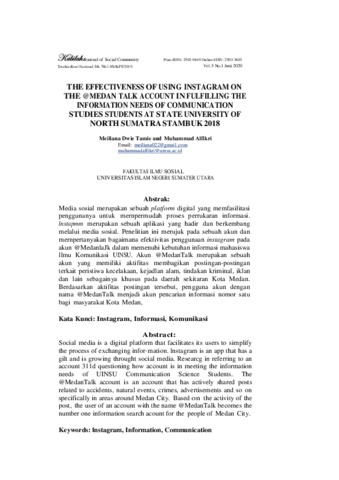 Tamie, Meiliana Dwie and Alfikri, Muhammad (2022) The Effectiveness of Using Instagram on the @Medan Talk Account in Fulfilling the Information Needs of Communication Studies Students at State Universitiy of North Sumatra Stambuk 2018. The Effectiveness of Using Instagram on the @Medan Talk Account in Fulfilling the Information Needs of Communication Studies Students at State Universitiy of North Sumatra Stambuk 2018, 7 (2). pp. 492-498. ISSN 2503-3603