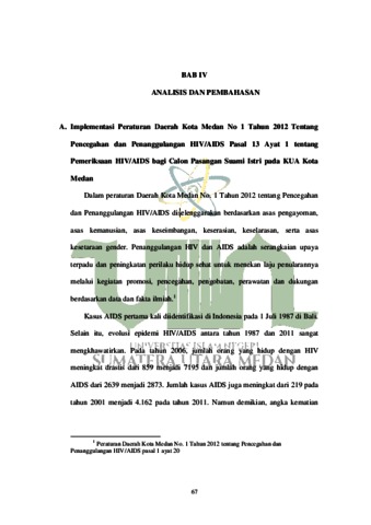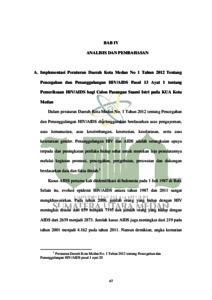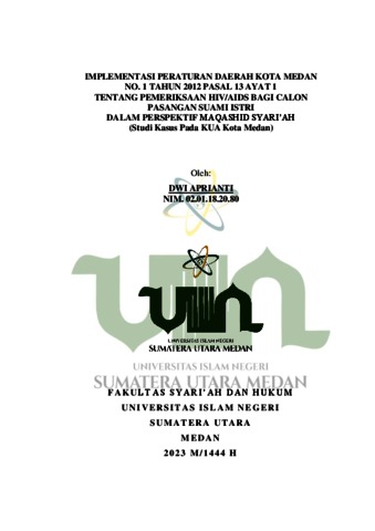 IMPLEMENTASI PERATURAN DAERAH KOTA MEDAN NO. 1 TAHUN 2012 PASAL 13 AYAT 1 TENTANG PEMERIKSAAN HIV/AIDS BAGI CALON PASANGAN SUAMI ISTRI DALAM PERSPEKTIF MAQASHID SYARI’AH (Studi Kasus Pada KUA Kota Medan)”. Penulis bernama Dwi Aprianti NIM: 0201182080 dari Program Studi Hukum Keluarga Islam Fakultas Syari’ah dan Hukum Universitas Islam Negeri Sumatera Utara. Berdasarkan data kasus HIV/AIDS di wilayah Sumatera Utara khususnya, tercatat bahwa kota Medan menjadi salah satu wilayah terbesar penyebaran atau penularan virus HIV dari tahun ke tahun. Menyikapi hal tersebut, pemerintah kota Medan mengeluarkan Peraturan Daerah Kota Medan No. 1 Tahun 2012 tentang Pencegahan dan Penanggulangan HIV/AIDS khususnya pada Pasal 13 Ayat 1 “memeriksakan diri bagi calon pasangan suami istri” dengan perspektif Maqashid Syari’ah sebagai pisau analisis. Penelitian ini bertujuan 1). Untuk mengetahui implementasi Peraturan Daerah kota Medan No. 1 tahun 2012 pasal 13 ayat 1 tentang pemeriksaan HIV/AIDS bagi calon pasangan suami istri pada KUA kota Medan. 2). Untuk mengetahui perspektif Maqashid Syari’ah tentang pemeriksaan HIV/AIDS bagi calon pasangan suami istri. Jenis penelitian ini ialah penelitian Yuridis Empiris. Penelitian hukum empiris sering disebut dengan penelitian hukum sosial atau penelitian lapangan. Pendekatan penelitian ini adalah pendekatan Yuridis Sosiologis. Teknik pengumpulan data dalam penelitian ini adalah wawancara, angket dan observasi. Hasil dari penelitian ini menyimpulkan bahwa KUA yang ada di kota Medan tidak menjalankan Peraturan Daerah ini sebagai syarat administrasi pranikah, disebabkan karena KUA belum mengetahui tentang Peraturan Daerah tersebut serta KUA berasalan tidak ingin memberatkan calon pengantin yang akan menikah. Berdasarkan perspektif Maqashid Syari’ah peraturan tersebut sudah sejalan dengan konsep Maqashid Syari’ah, pelaksanaan pemeriksaan HIV/AIDS pranikah adalah sesuatu yang harus dalam rangka memelihara jiwa dan keturunan. Pemeriksaan kesahatan pranikah merupakan langkah pencegahan terhadap penyakit yang dapat membahayakan bagi pasangan atau anak-anaknya kelak harus segera diatasi, karena akibatnya dapat merusak cita-cita luhur perkawinan dan menghilangkan sesuatu yang berbahaya bagi kelangsungan hubungan rumah tangga yang akan dibangun adalah suatu keharusan. Pemeriksaan HIV/AIDS bagi calon pasangan suami istri merupakan upaya preventif dari pemerintah kota Medan untuk mengurangi tingkat penularan HIV/AIDS pada keluarga.