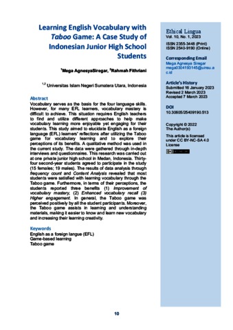 Siregar, Mega Agnesya and Fithriani, Rahmah (2023) Learning English Vocabulary with Taboo Game: A Case Study of Indonesian Junior High School Students. Ethical Lingua: Journal of Language Teaching and Literature, 10 (1). pp. 10-21. ISSN 2540-9190
