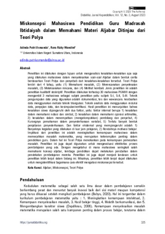 Usmanda, Adinda Putri and Wandini, Rora Rizky (2023) Miskonsepsi Mahasiswa Pendidikan Guru Madrasah Ibtidaiyah dalam Memahami Materi Aljabar Ditinjau dari Teori Polya. Didaktika: Jurnal Kependidikan, 12 (3). pp. 325-336. ISSN 2745-4312