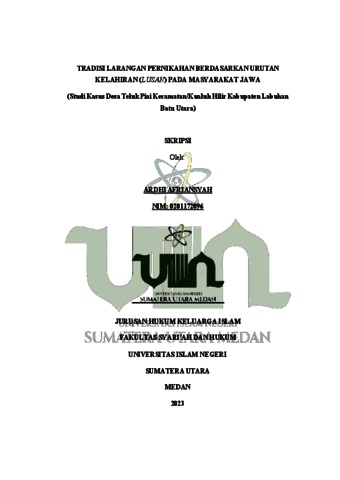 Afriansyah, Ardhi (2023) Tradisi Larangan Pernikahan Berdasarkan Urutan Kelahiran (Lusan) pada Masyarakat Jawa (Studi Kasus Desa Teluk Piai Kecamatan Kualuh Hilir Kabupaten Labuhan Batu Utara). Skripsi thesis, Universitas Islam Negeri Sumatera Utara Medan.