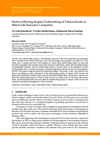 Ramadhani, Tri Azmi (2023) Factors Affecting Surplus Underwriting of Tabarru Funds in Sharia Life Insurance Companies. Indonesian Journal of Economics and Management, 3 (3). pp. 646-658. ISSN 2747-069