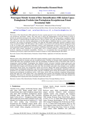 Iqbal, Muhammad Penerapan Metode System of Rice Intensification (SRI) dalam Upaya Peningkatan Produksi dan Peningkatan Kesejahteraan Petani Kecamatan Sakti. Jurnal Informatika Ekonomi Bisnis, 3 (2).