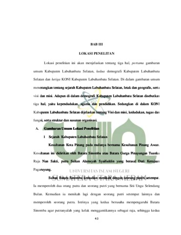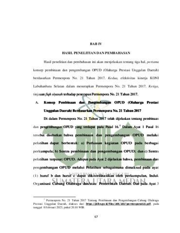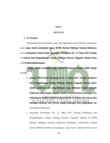 siregar, nurhidayah (2023) EFEKTIVITAS KINERJA KONI DALAM PENERAPAN PERMENPORA NO. 21 TAHUN 2017 TENTANG PEMBINAAN DAN PENGEMBANGAN CABANG OLAHRAGA PRESTASI UNGGULAN DAERAH (Perspektif Fiqh Siyasah Studi Kasus di Kabupaten Labuhanbatu Selatan). Skripsi thesis, universitas negeri islam sumatra utara.
