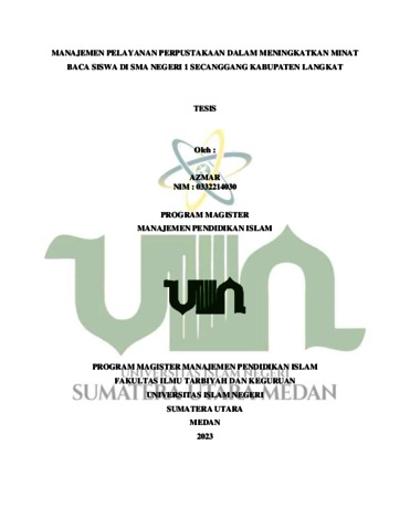 Azmar, Azmar (2023) MANAJEMEN PELAYANAN PERPUSTAKAAN DALAM MENINGKATKAN MINAT BACA SISWA DI SMA NEGERI 1 SECANGGANG KABUPATEN LANGKAT. Skripsi thesis, Universitas Islam Negeri Sumatera Utara.