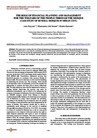 Rayyani, Azka and Samad, Khairunnisa Abd and Harmain, Hendra THE ROLE OF FINANCIAL PLANNING AND MANAGEMENT FOR THE WELFARE OF THE PEOPLE THROUGH THE MOSQUE (CASE STUDY OF SEVERAL MOSQUES IN MEDAN CITY). Journal of Humanities and Social Studies. (Submitted)