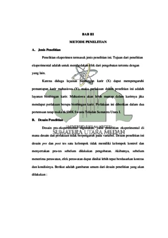 Penelitian ini bertujuan untuk mengetahui bagaimana pengaruh bimbingan karir dalam pemantapan karir peserta didik di SMK swasta teladan sumatera utara I, serta mengetahui apakah layanan bimbingan karir berpengaruh terhadap pemantapan peserta didik. Metode yang digunakan dalam penelitian ini adalah metode eksperimen, dengan menggunakan pendekatan kuantitatif. Desain penelitian yang digunakan adalah Pre-eksperimental Design yaitu penelitian eksperimen yang desain dan perlakuanya tidak ada pengontrolan variabel sama sekali. Desain (One group Pretest-Posttest Design) penelitian ini tanpa menggunakan kelompok kontrol dan desain ini terdapat pretest sebelum diberikan perlakuan. Proses pengumpulan data menggunakan observasi, dokumentasi, Angket, Angket ini menggunakan teori super yang menyatakan bahwa aspek yang dapat digunakan dalam pemantapan atau pematangan karir ada 4 yaitu perencanaan karir, eksplorasi karir, pengetahuan tentang membuat keputusan karir dan pengetahuan informasi tentang dunia karya. Analisis data yaitu, Uji Deskriptif, dan Uji Paried Simple t-test. Hasil dari penelitian ini menunjukkan bahwa terdapat Pengaruh layanan bimbingan karir terhadap pemantapan karir peserta didik di SMK swasta teladan sumatera utara I sebelum dan sesudah diberikan perlakukan tritmen yang berupa layanan bimbingan karir dengan topik yang berbeda. Penelitian ini diyatakan berpengaruh karena siswa SMK memiliki pemantapan karir yang cukup optimal, siswa sudah tidak merasa bingung mengenai pemantapan karir mereka.
