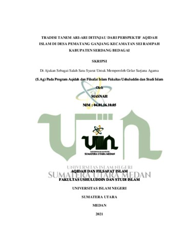 Masnah, Masnah (2021) TRADISI TANEM ARI-ARI DITINJAU DARI PERSPEKTIF AQIDAH ISLAM DI DESA PEMATANG GANJANG KECAMATAN SEI RAMPAH KABUPATEN SERDANG BEDAGAI. Skripsi thesis, Universitas Islam Negeri Sumatera Utara.