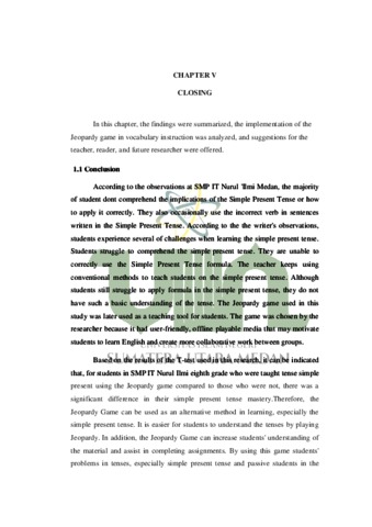 Putri, Annisa Aulia The Effect of Jeopardy Game in Teaching Simple Present Tense at Eighth Grade of Junior High School in SMP IT Nurul 'Ilmi. Universitas Islam Negeri Sumatera Utara.