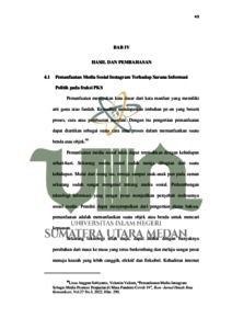 Skripsi ini mendeskripsikan tentang Pemanfaatan Media Sosial Instagram Sebagai Sarana Informasi Politik Fraksi PKS Provinsi Sumatera Utara. Partai PKS terlahir dari gerakan reformasi 1998, dan dapat dikatakan PKS merupakan partai nasionalis. Pada tanggal 20 Juli 1998, PKS berdiri dengan nama awal Partai Keadilan (disingkat PK) dalam sebuah konferensi pers di Aula Masjid Al-Azhar, Kebayoran Baru, Jakarta. Presiden (ketua) partai ini adalah Nurmahmu di Isma'il. Penelitian ini dimaksudkan untuk mengetahui sejauh mana pemahaman kemampuan humas PKS tentang pemanfaatan media sosial instagram sebagai sarana informasi politik. Penelitian ini menerapkan metode kualitatif dengan teknik studi lapangan (wawancara dan observasi). Aspek-aspek yang akan diteliti meliputi pemanfaatan media sosial instagram terhadap sarana informasi politik pada fraksi PKS, faktor penghambat pada pemanfaatan media sosial instagram fraksi PKS sebagai informasi politik, cara membuat e–flyer yang menarik menurut humas PKS. Dengan mengkaji aspek–aspek tersebut, penelitian ini bertujuan untuk memahami sejauh mana humas partai dalam pemanfaatan media sosial instagram sebagai sarana informasi politik. Hasil dari penelitian ini menyebutkan bahwa pada akun instagram Fraksi PKS Provinsi Sumatera Utara yaitu @fraksipkssumut yang terbilang cukup aktif di akunnya di bandingkan oleh fraksi yang lain, serta memiliki jumlah pengikut terbanyak dari pada fraksi lain juga. Terpantau tim humas fraksi cukup aktif memposting kegiatan partai, mulai dari melakukan sosialisasi resmi dengan masyarakat, membagian postingan gelar kajian rutin, melakukan bincang online melalui fitur live pada instagram atau bahkan merekam perbincangan dan menguploadnya dari fitur video atau reels yang disediakan oleh instagram, menyebarkan informasi mengenai event-event yang diadakan partai dan masih banyak lagi. Selain itu, banyak hal yang harus diperhatikan untuk membuat e– flyer yang baik, serta menarik dan unik bagi publik atau pembaca.
