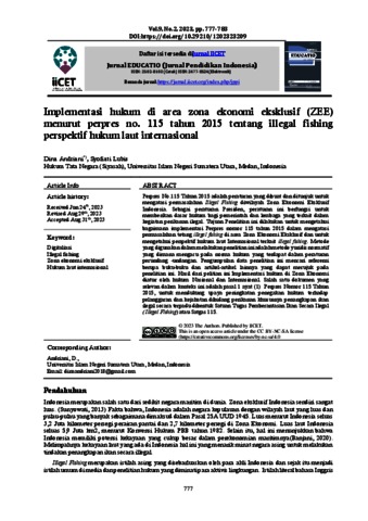 Perpres No.115 Tahun 2015 adalah peraturan yang dibuat dan ditunjuk untuk mengatasi permasalahan Illegal Fishing diwilayah Zona Ekonomi Eksklusif Indonesia. Sebagai peraturan Presiden, peraturan ini berfungsi untuk memberikan dasar hukum bagi pemerintah dan lembaga yang terkait dalam kegiatan perikanan ilegal. Tujuan Penelitian ini dilakukan untuk mengetahui bagaimana implementasi Perpres nomor 115 tahun 2015 dalam mengatasi permasalahan tetang illegal fishing di area Zona Ekonomi Eksklusif dan untuk mengetahui perspektif hukum laut Internasional terkait illegal fishing. Metode yang digunakan dalam melakukan penelitian ini adalah metode yuridis normatif yang dimana mengacu pada norma hukum yang terdapat dalam peraturan perundang -undangan. Pengumpulan data penelitian ini mencari referensi berupa buku-buku dan artikel-artikel lainnya yang dapat merujuk pada penelitian ini. Hasil dari pelitian ini Implementasi hukum di Zona Ekonomi diatur oleh hukum Nasional dan Internasional. Salah satu dokumen yang relevan dalam konteks ini adalah pasal 1 ayat (1) Perpres Nomor 115 Tahun 2015, untuk mendukung upaya peningkatan penegakan hukum terhadap pelanggaran dan kejahatan dibidang perikanan khususnya penangkapan ikan ilegal secara terpadu dibentuk Satuan Tugas Pemberantasan Ikan Secara Ilegal ( Illegal Fishing) atau Satgas 115.