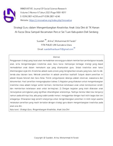 Suaidah, Suaidah and Arlina, Arlina and Farabi, Mohammad Al (2023) Strategi Guru dalam Mengembangkan Kreativitas Anak Usia Dini di TK Hanan Al-Fazza Desa Sampali Kecamatan Percut Sei Tuan Kabupaten Deli Serdang. INNOVATIVE: Journal Of Social Science Research, 3 (6). pp. 9061-9077. ISSN 2807-4238