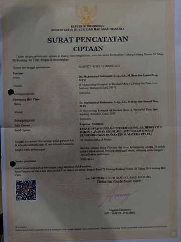 Dalimunte, Muhammad and Haq, Samsul (2023) HAKI Efektivitas Kinerja Universitas Negeri Berstatus Badan Layanan Umum (BLU) (Studi Kasus Pusat Pengembangan Bahasa UIN Sumatera Utara). Universitas Islam Negeri Sumatera Utara.