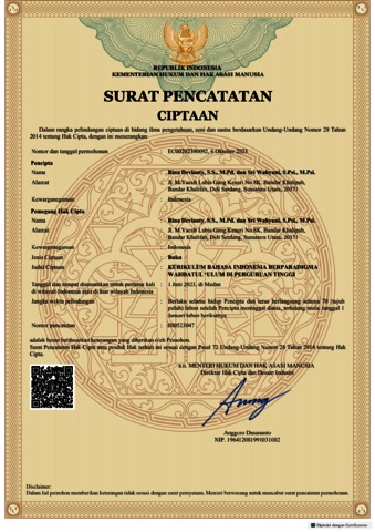 Devianty, Rina (2023) Surat Pencatatan Ciptaan Kurikulum Bahasa Indonesia Berparadigma Wahdatul 'Ulum di Perguruan Tinggi. Kementerian Hukum dan HAM, Medan.