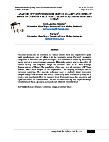 Siburian, Nelsi Agustina and Nurbait, Nurbait (2023) Analysis of the Influence of Service Quality and Company Image on Customer Trust in PT Jasa Raharja Representative Medan. Indonesian Interdisciplinary Journal of Sharia Economics (IIJSE), 6 (3). pp. 1624-1644. ISSN 2621-606X