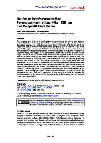 Hasibuan, Tama Sentia and Sahputra, Dika (2023) Gambaran Self-Acceptance Bagi Perempuan Hamil di Luar Nikah Ditinjau dari Perspektif Teori Germer. GUIDENA: Jurnal Ilmu Pendidikan, Psikologi, Bimbingan dan Konseling, 13 (2). pp. 306-316. ISSN 2442-7802