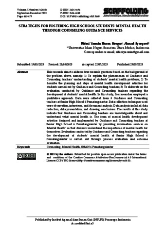 Siregar, Rifani Yasmin Husan and Syarqawi, Ahmad (2023) Strategies for Fostering Hiht School Students' Mental Health Through Counseling Guidance Service. Scaffolding: Jurnal Pendidikan Islam dan Multikulturalisme, 5 (3). pp. 465-479. ISSN 2656-4491
