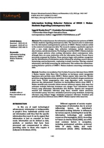: Penelitian ini membahas Pola Perilaku Pencarian Informasi Siswa SMKN 1 Medan Seputar Idola Masa Kini. Penelitian ini bertujuan untuk mengetahui bagaimana pola perilaku siswa SMKN 1 Medan seputar idola masa kini. Metode penelitian yang digunakan dalam penelitian ini ialah kualitatif, dengan pendekatan studi kasus. Teknik pengumpulan data yang digunakan yaitu, wawancara, observasi dan dokumentasi. Penelitian ini menunjukkan bahwa siswa SMKN 1 Medan memiliki pola tersendiri dalam mencari informasi seputar idola masa kini walaupun terdapat beberapa kesamaan cara dengan Teori Information Search Process yang sebelumnya dikemukakan oleh Khultau. Dimulai dari mengenali masalah dan kebutuhan informasi yang dicari, memilih sistem pencarian, merumuskan query/ kata kuci, melakukan pencarian yang mendalam, menyaring informasi yang didapat hingga melakukan penyajian informasi. Demikian pola perilaku pencarian informasi siswa SMKN 1 Medan seputar idola masa kini.