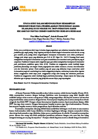 Sitepu, Nur Alfina Sari and Hanum OK, Azizah (2023) Upaya Guru dalam Meningkatkan Kemampuan Berkomunikasi pada Pembelajaran Pendidikan Agama Islam (PAI) di SD Negeri No.104274 Pematang Kasih Kecamatan Pantai Cermin Kabupaten Serdang Bergadai. Jurnal Pendidikan Islam, 13 (2). pp. 26-35. ISSN 2777-0532