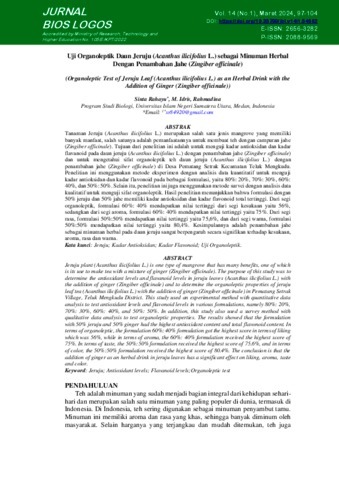 Uji Organoleptik Daun Jeruju (Acanthus ilicifoliusL.) sebagai Minuman Herbal dengan Penambahan Jahe (Zingiber officinale)