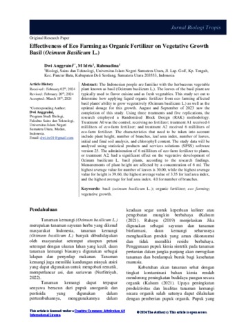 The Indonesian people are familiar with the herbaceous vegetable plant known as basil (Ocimum basilicum L.). The leaves of the basil plant are typically used to flavor cuisine and as fresh vegetables. This study set out to determine how applying liquid organic fertilizer from eco farming affected basil plants' ability to grow vegetatively (Ocimum basilicum L.) as well as the optimal dosage for this growth.August and September of 2023 saw the completion of this study. Using three treatments and five replications, the research employed a Randomized Block Design (RAK) methodology. Treatment A0 was the control, receiving no fertilizer; treatment A1 received 4 milliliters of eco-farm fertilizer; and treatment A2 received 6 milliliters of eco-farm fertilizer.The characteristics that need to be taken into account include plant height, number of branches, leaf area index, number of leaves, initial and final soil analysis, and chlorophyll content. The study data will be analyzed using statistical products and services solutions (SPSS) software version 25. The administration of 6 milliliters of eco-farm fertilizer to plants, or treatment A2, had a significant effect on the vegetative development of Ocinum basilicum L. basil plants, according to the research findings. Measurements of plant height are affected by a concentration of 6 ml. The highest average value for number of leaves is 30.00, while the highest average value for height is 39.60, the highest average value of 3.35 for leaf area index, and the highest average for leaf area index. 4.0 for number of branches.