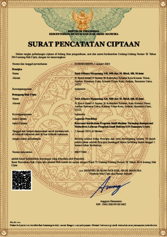 Marpaung, Zaid Alfauza and Rizal, Muhammad (2024) Surat Pencatatan Ciptaan Relevansi Kurikulum Program Studi Hukum terhadap Kompetensi Mahasiswa Lulusan Program Studi Hukum UIN Sumatera Utara. Kementerian Hukum dan HAM, Medan.