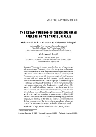 Nasution, Muhammad Roihan and Hidayat, Muhammad and Rasyid, Muhammad (2023) The Ta'liqat Method of Sheikh Sulaiman Arrasuli on the Tafsir Jalalain. Journal of Contemporary Islam and Muslim Societies, 7 (2). pp. 293-321. ISSN 2528-7435