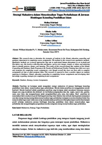Febriani, Melisa and Aulia, Dinda and Arlina, Arlina (2024) Strategi Mahasiswa dalam Menyelesaikan Tugas Perkuliahaan di Jurusan Bimbingan Konseling Pendidikan Islam. Jurnal Pendidikan dan Ilmu Sosial, 2 (4). ISSN e-ISSN: 2985-7716, p-ISSN: 2985-6345